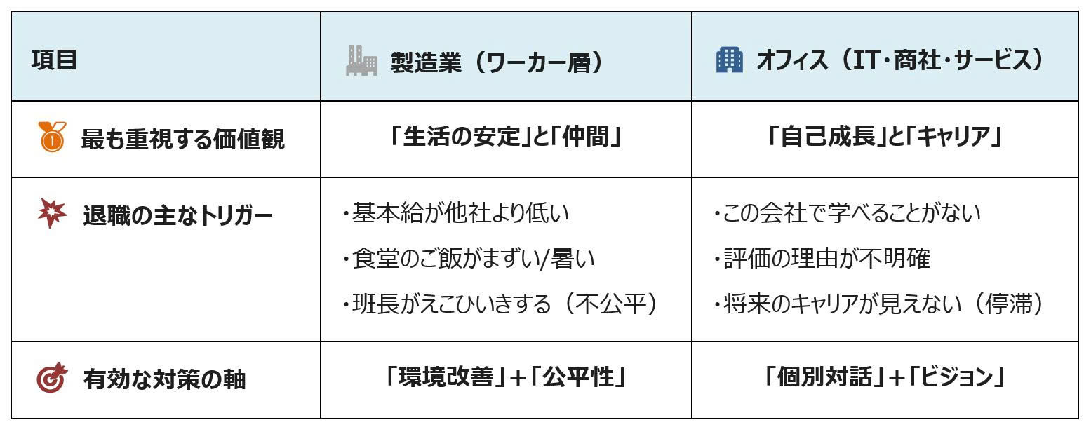 このように、工場作業員に「ビジョン」を熱く語っても響きにくく、逆にITエンジニアに「食堂の改善」だけを訴えても離職は止まりません。それぞれのツボを押さえる必要があります。